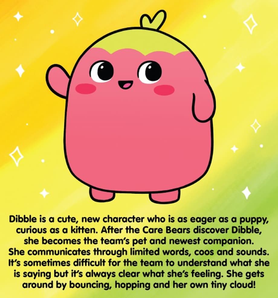 Cloudco aim to pay homage to the classic Care Bears brand, with the sleek 2D animation style, whilst also evolving it - by introducing new characters like Dibble, the colourful crew's new pet, who you can see below: