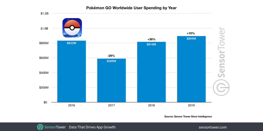 Pokémon GO earned $894 million last year. Only the $832 million earned in 2016 comes close to that amount.