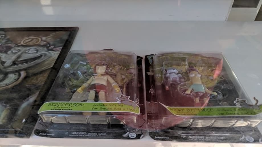 As you can see, there are interesting pieces of artwork you can purchase, masks of Morties and a wide variety of Ricks. It's interesting to see the amount of detail put into them, giving the Rick masks different hairstyles recognizable to fans from the show's own Council of Ricks. The action figures are actually quite interesting themselves, as the five of them - Rick, Morty, Mr. Meseeks, Birdperson, and Mr. Poopy Butthole - all come with a piece to assemble a Snowball Build a figure, with these five building the entirety of the figure.