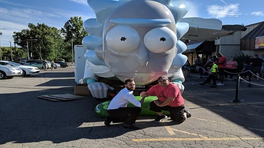 Here we see more staff members alongside the actual Rickmobile itself, which you can tell by Rick's backside hanging over the top opposite where his oversized head is in the back. The side of the truck pops up to reveal the exclusive merchandise inside, and on the door of the vehicle you'll notice the