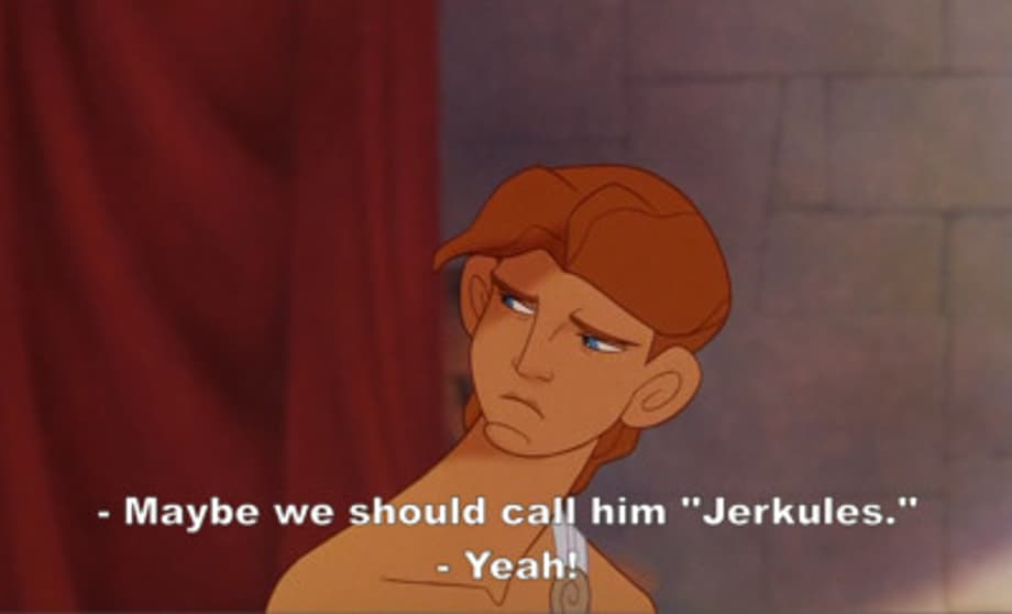 Disney does quite well in adapting the tale for young kids, removing from play Zeus' adulterous affair and finding a more child-friendly way to introduce mortality to the title hero. However there are definitely moments in the film that would go over most children's heads, for instance - this gem pictured below.