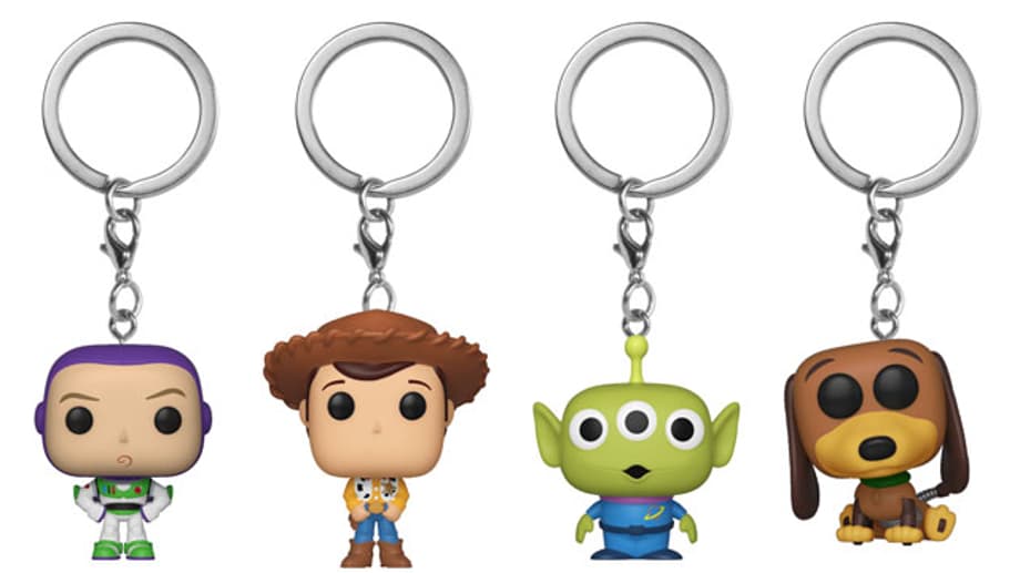 There's also a new version of Buzz based on a portion of the first instalment in which Sid's sister got her hands on him and renamed him: Mrs. Nesbitt. The centerpiece of the new set is Woody riding atop RC. As well as those, there are also now keychain versions of Buzz, Woody, the iconic Alien, and Slinky.