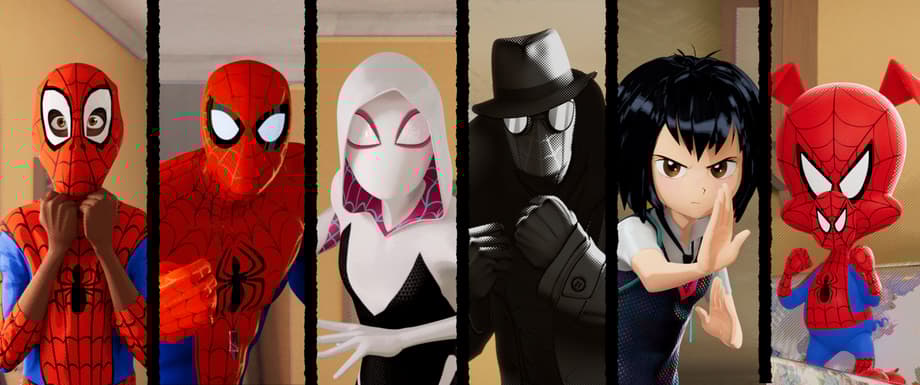 Miles Morales (Shameik Moore), Peter Parker (Jake Johnson), Spider-Gwen (Hailee Steinfeld), Spider-Man Noir (Nicolas Cage), Peni Parker (Kimiko Glenn) and Spider-Man (John Mulaney) in Columbia Pictures and Sony Pictures Animation's SPIDER-MAN: INTO THE SPIDER-VERSE.